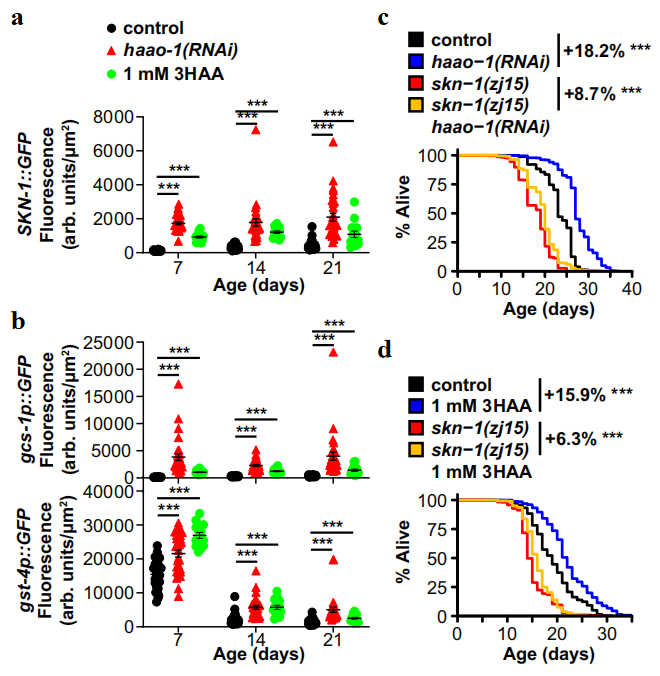 Moreover, 3HAA supplementation conferred resistance to oxidative stress and activated the oxidative stress response transcription factor SKN-1 (homologous to mammalian Nrf2). This activation was evident through elevated expression of SKN-1::GFP and glutathione synthesis reporters (Figure 3a-b). Lifespan extension was partially suppressed in skn-1 mutants, suggesting that 3HAA initiates a protective stress response through skn-1 activation and may extend lifespan in response to regulated ROS signaling (Figure 3c-d).